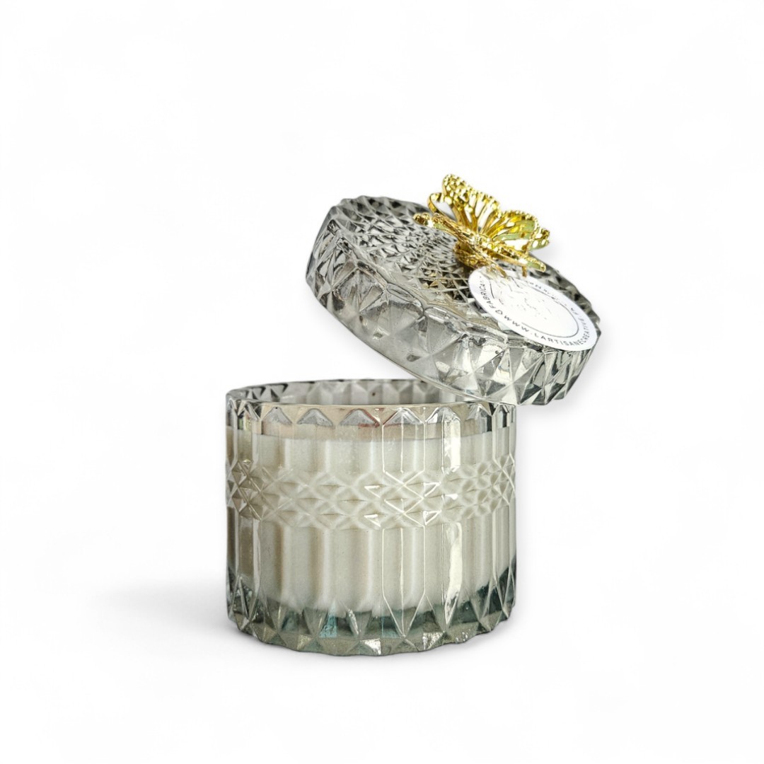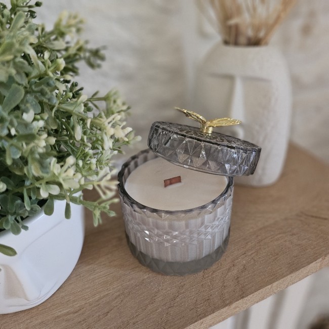 Coulée à la main dans un élégant pot en verre noir transparent, orné d’un couvercle décoré d’un papillon doré, cette bougie associe élégance, authenticité et respect de l’environnement. Sa mèche en bois de cerisier crépitante reproduit le doux son d’un feu de cheminée, créant une ambiance chaleureuse et apaisante.