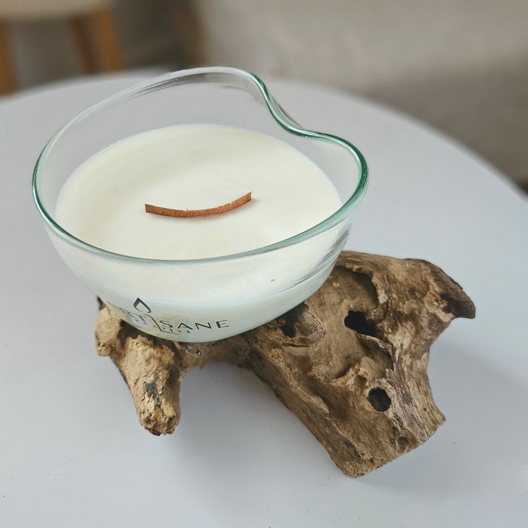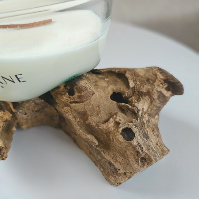 Cette bougie artisanale parfumée Cannelle Orange est présentée dans un verre soufflé posé sur une véritable racine de bois naturel. Chaque pièce est unique : la forme du bois, façonnée par le temps, donne à chaque bougie son caractère.