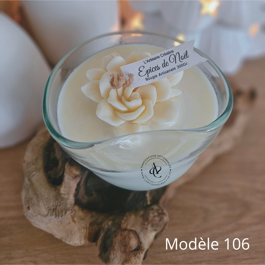 Apportez chaleur et authenticité à votre intérieur avec la bougie artisanale parfumée Épices sur racine de bois avec fleur en cire.