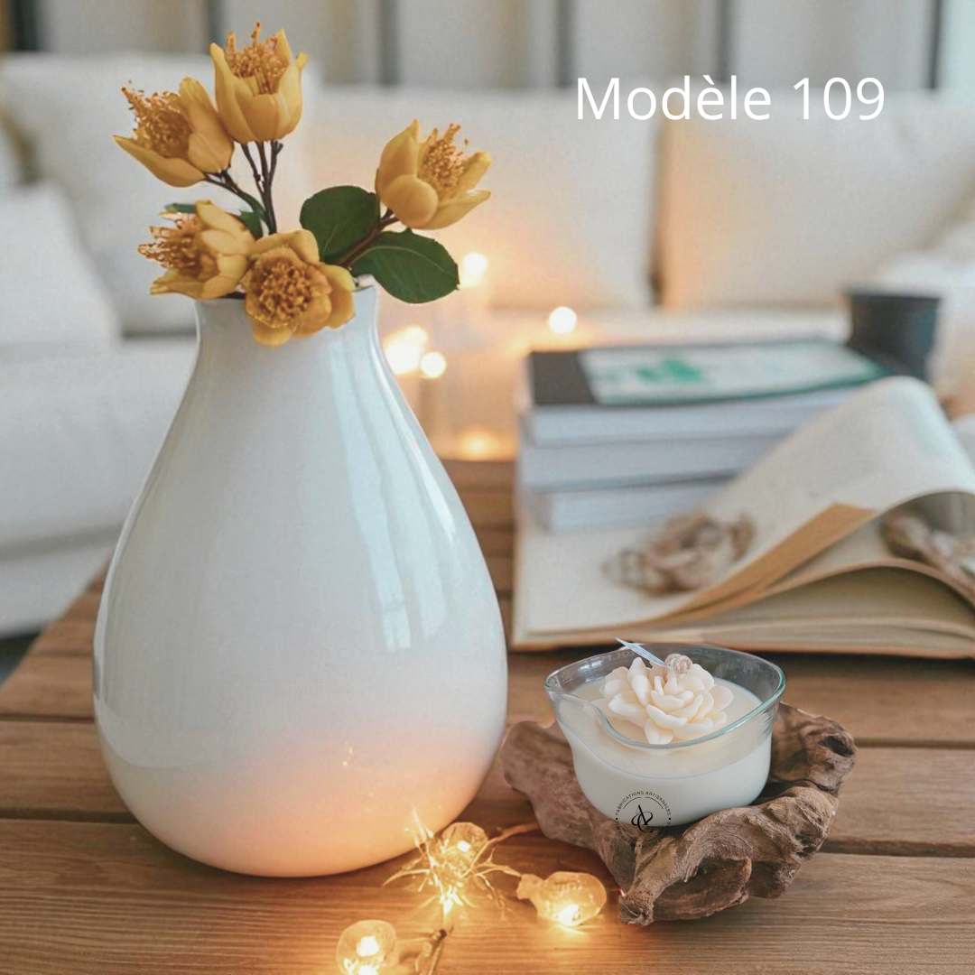 Chaque pièce est une création unique : un verre soufflé à la main directement adapté à une racine de bois de Gayac, sublimé par une fleur en cire végétale au centre. Le résultat ? Une bougie d’exception, où la nature brute rencontre l’artisanat raffiné.