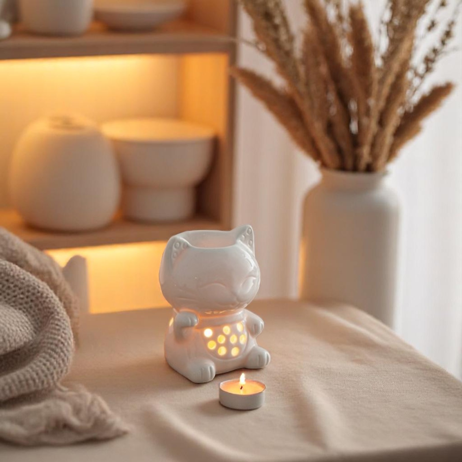 ✨ Laissez entrer la chance et la douceur dans votre maison avec ce brûleur Chat Maneki-neko en céramique blanche : un diffuseur original, décoratif et porte-bonheur.
