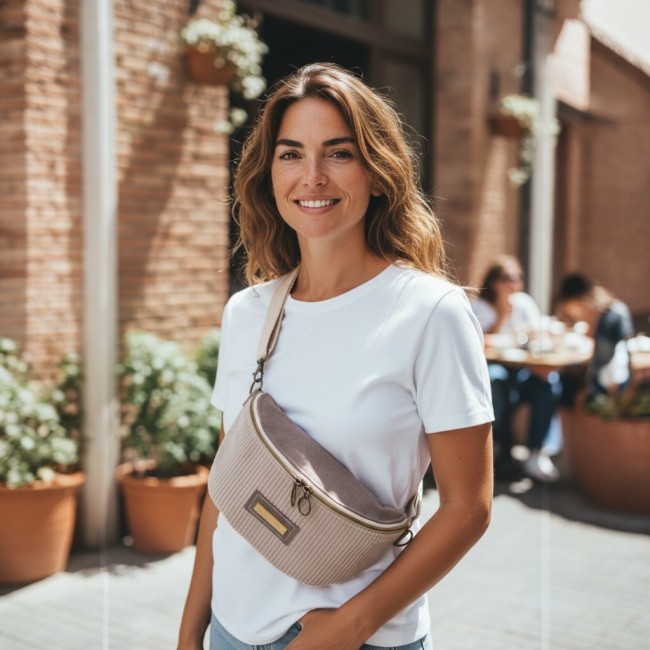 Alliez praticité et élégance avec ce sac banane artisanal en velours côtelé crème et suédine taupe, confectionné à la main avec soin. Léger et fonctionnel, il vous permet de garder vos essentiels à portée de main tout en apportant une touche sobre et raffinée à votre style.