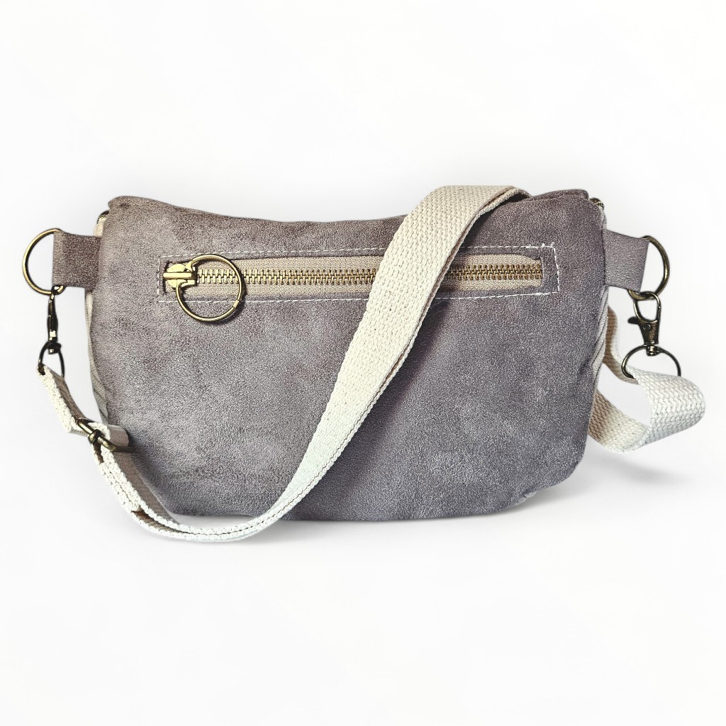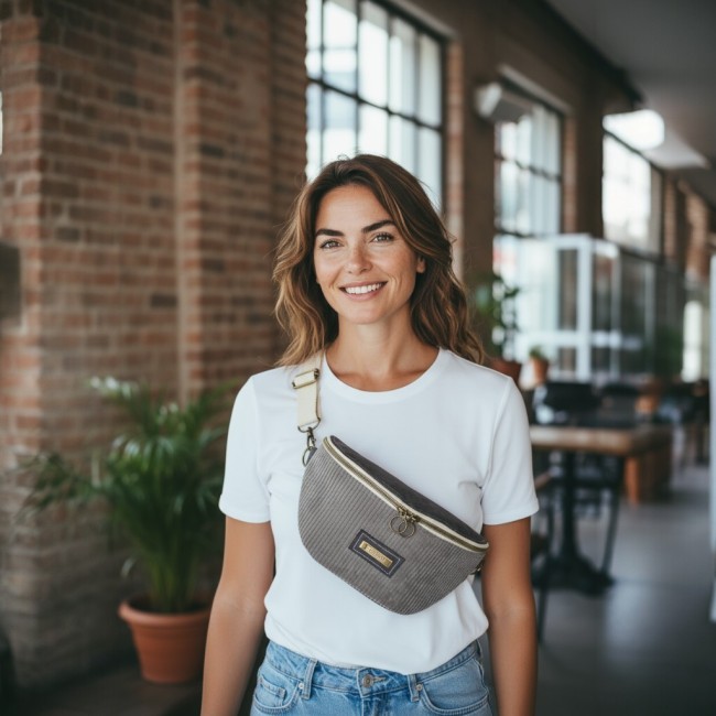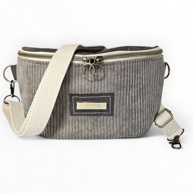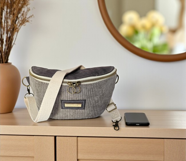 Alliez élégance et praticité avec ce sac banane artisanal en velours côtelé gris et suédine grise, confectionné à la main avec soin. Son mélange de textures lui confère un caractère unique, tout en restant sobre et facile à assortir à toutes vos tenues.