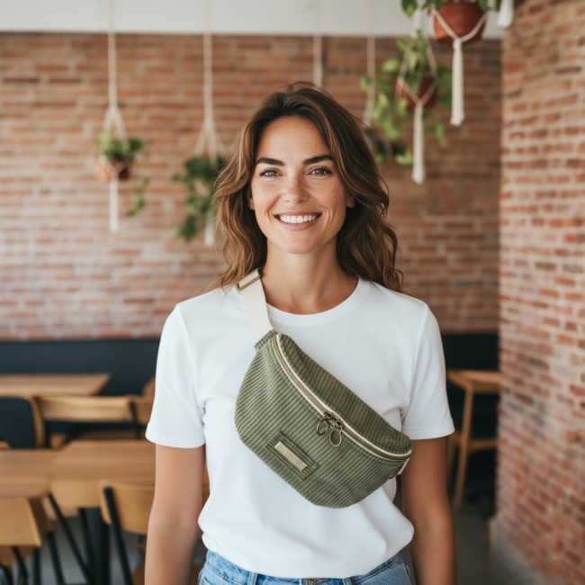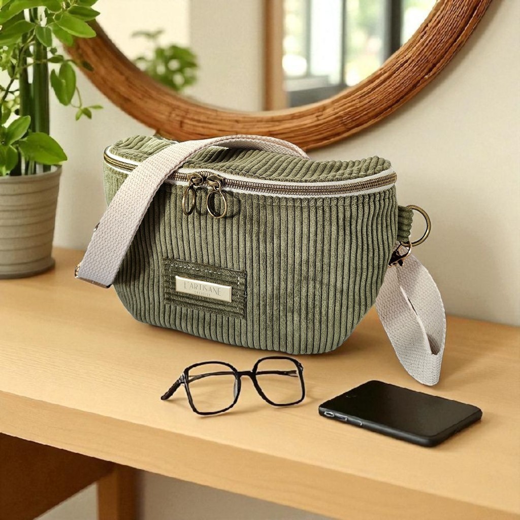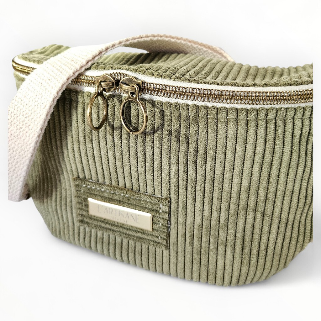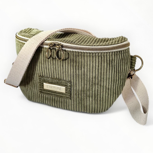 Optez pour un accessoire à la fois pratique et tendance avec ce sac banane artisanal en velours côtelé kaki, confectionné avec soin. Grâce à sa bandoulière réglable en coton écru, il peut se porter aussi bien en bandoulière qu’à la taille, selon vos envies.