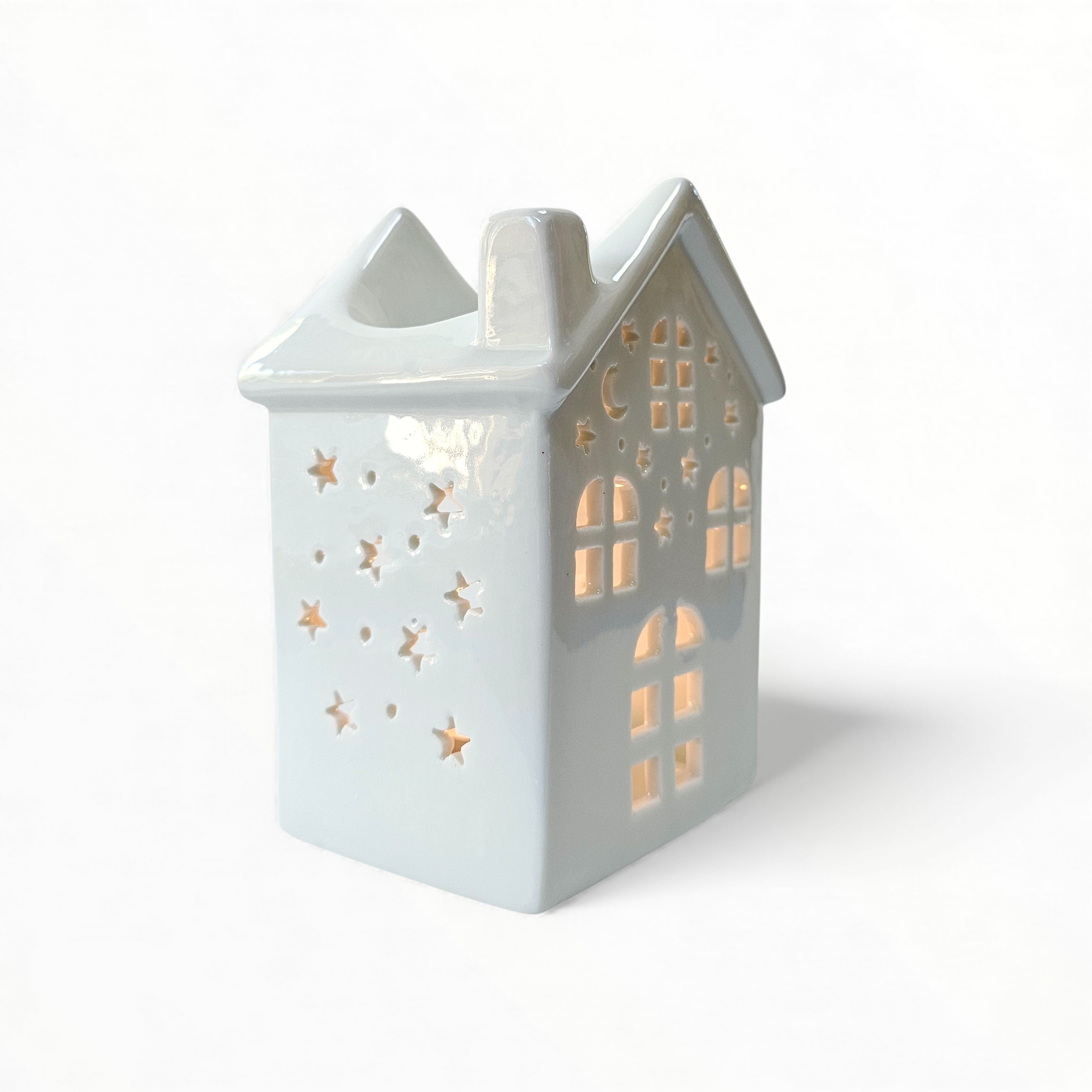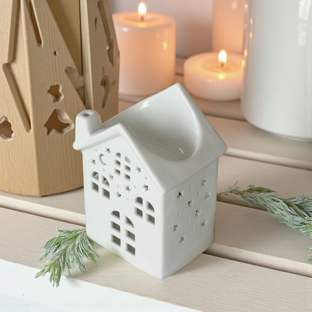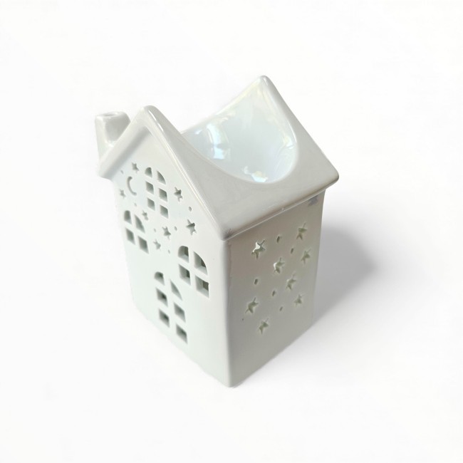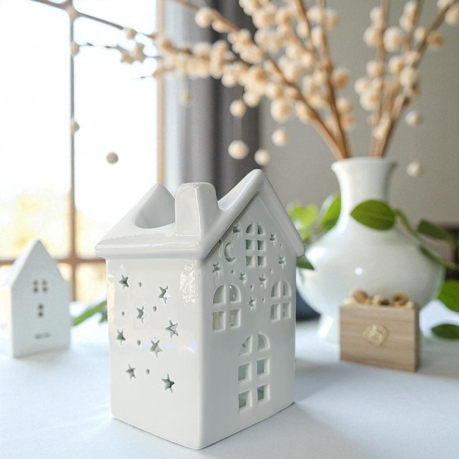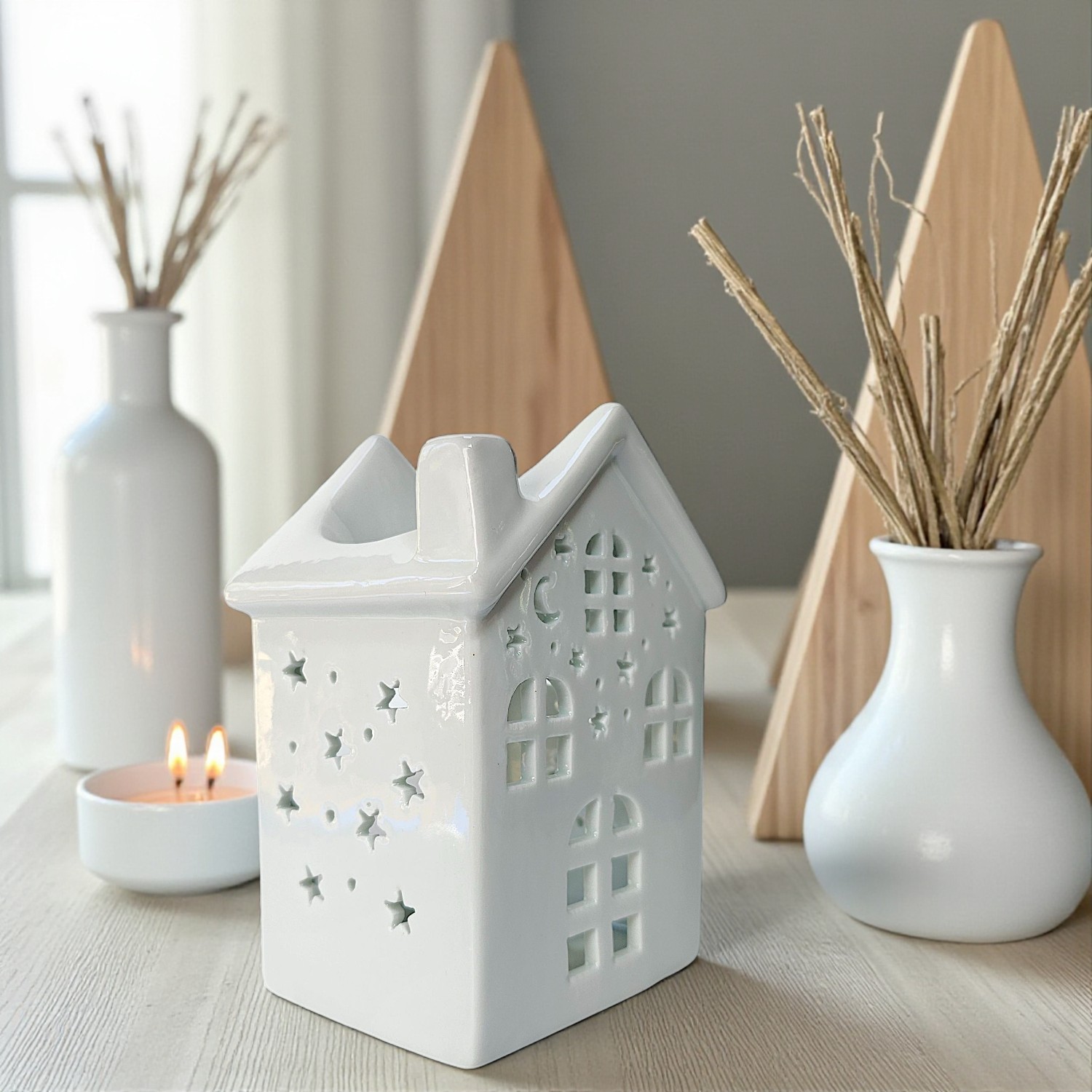 Craquez pour ce brûleur en céramique blanche en forme de petite maison, à la fois décoratif et utile. Ses ouvertures en forme d’étoiles et de fenêtres laissent passer une lumière douce et tamisée, créant une ambiance chaleureuse et apaisante.