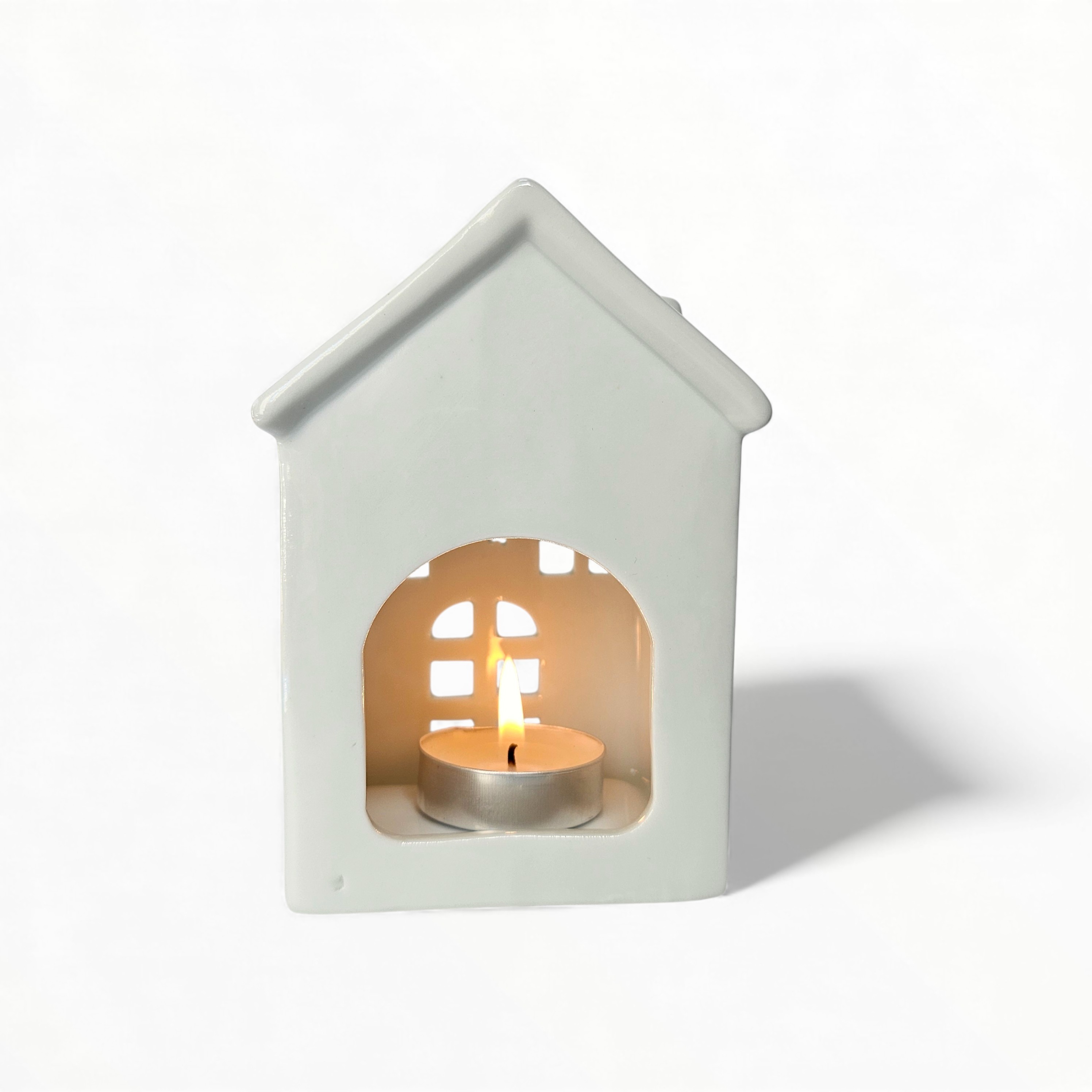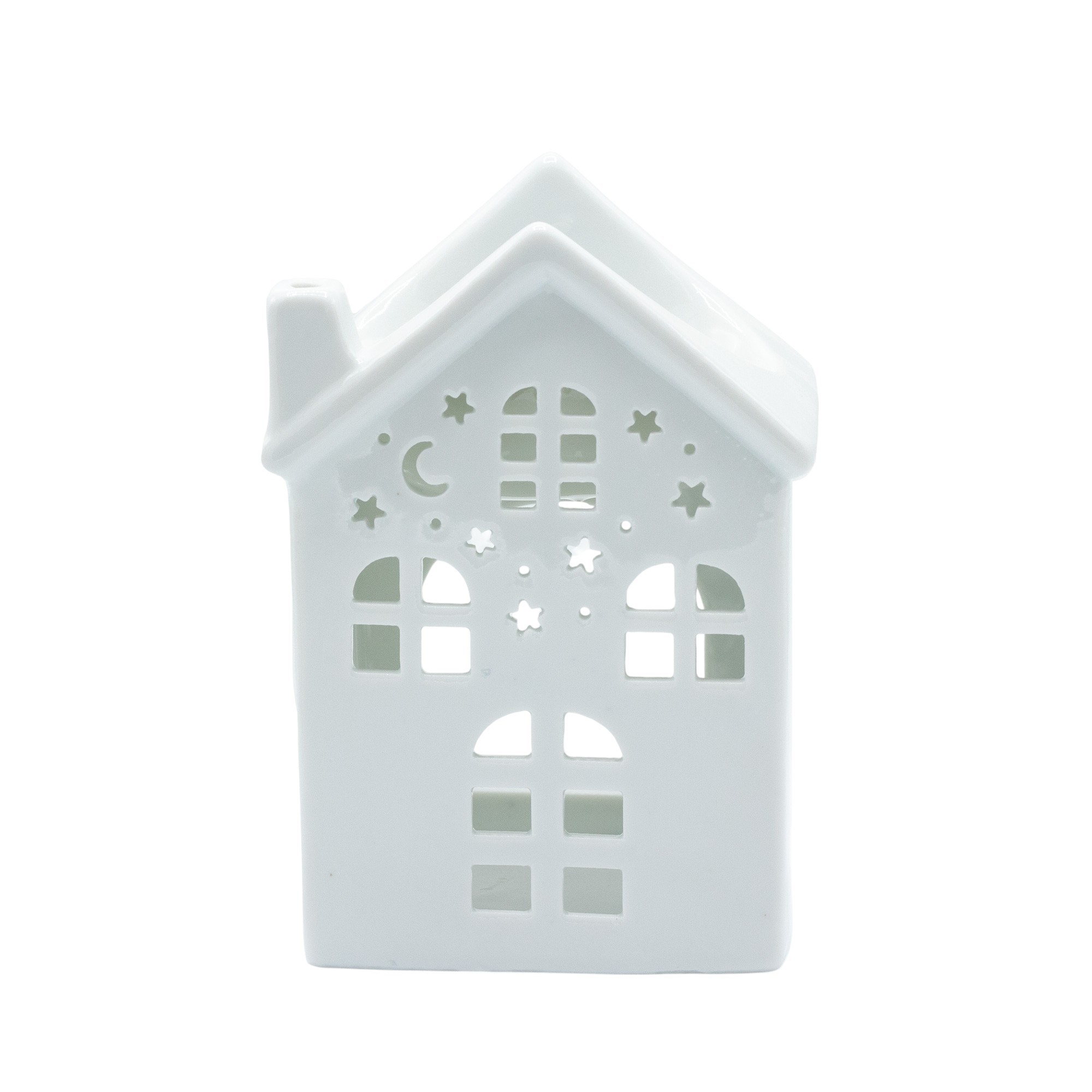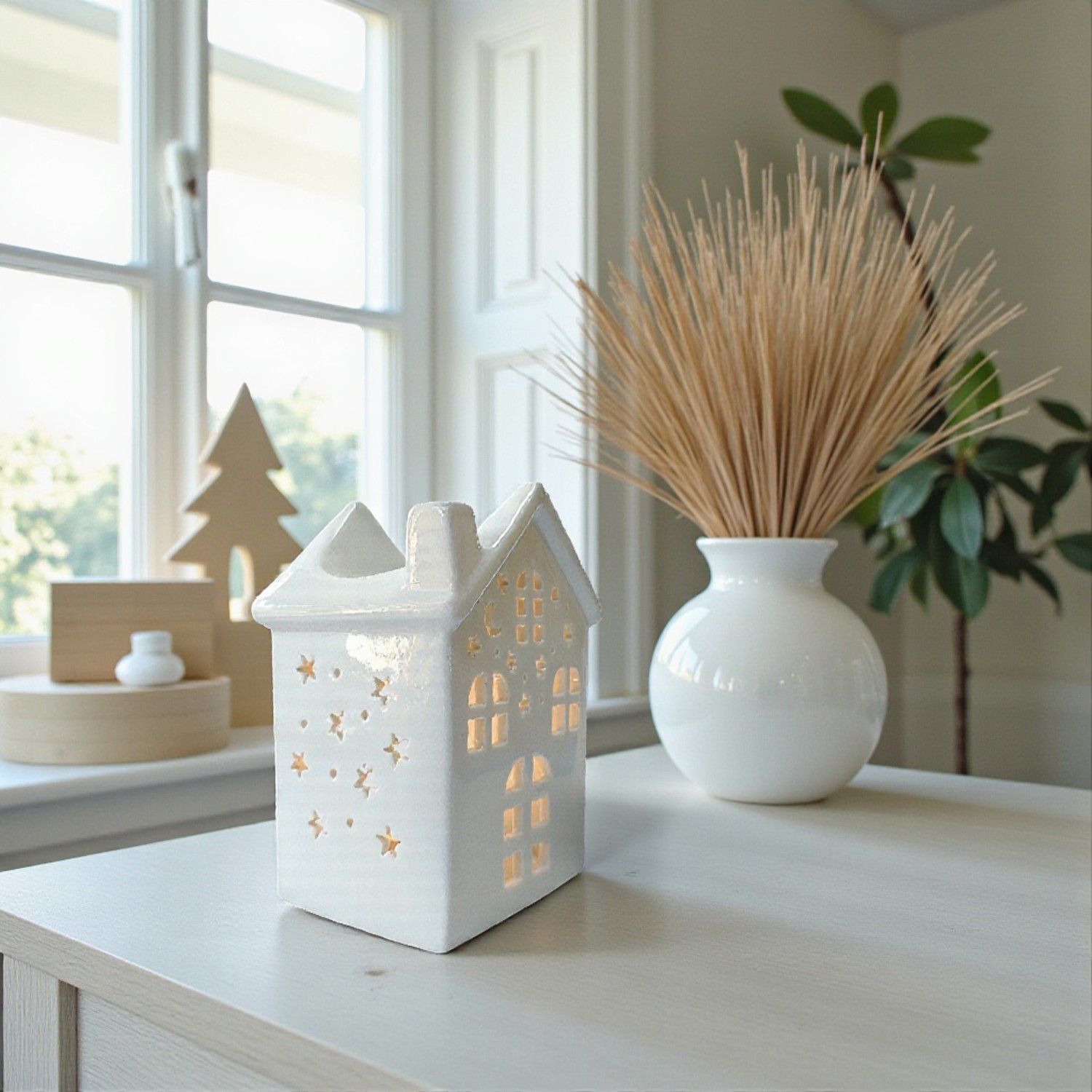 Craquez pour ce brûleur en céramique blanche en forme de petite maison, à la fois décoratif et utile. Ses ouvertures en forme d’étoiles et de fenêtres laissent passer une lumière douce et tamisée, créant une ambiance chaleureuse et apaisante.