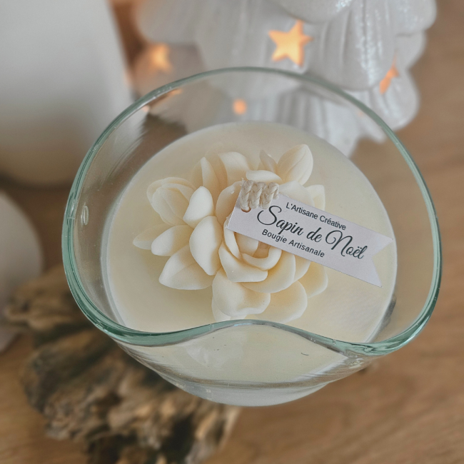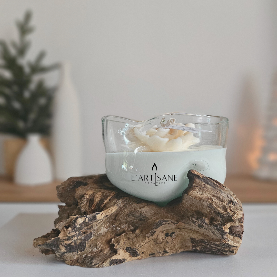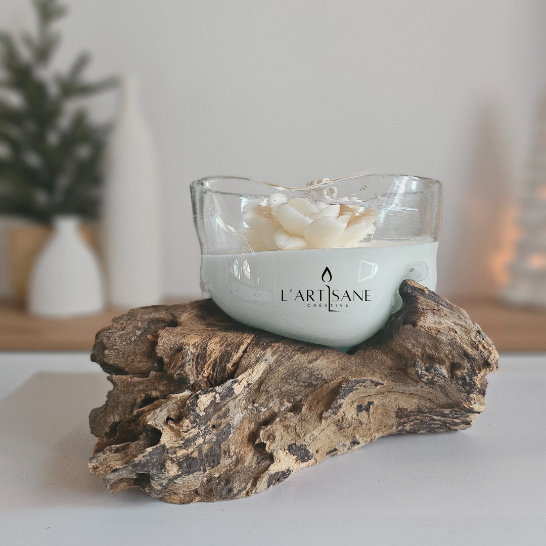 Chaque pièce est un véritable objet décoratif : un verre soufflé à la main délicatement posé sur une racine de bois de Guyac, aux formes uniques qui rendent chaque création totalement singulière. En son cœur, une fleur en cire végétale vient sublimer l’ensemble pour créer une atmosphère festive et douce à la fois.