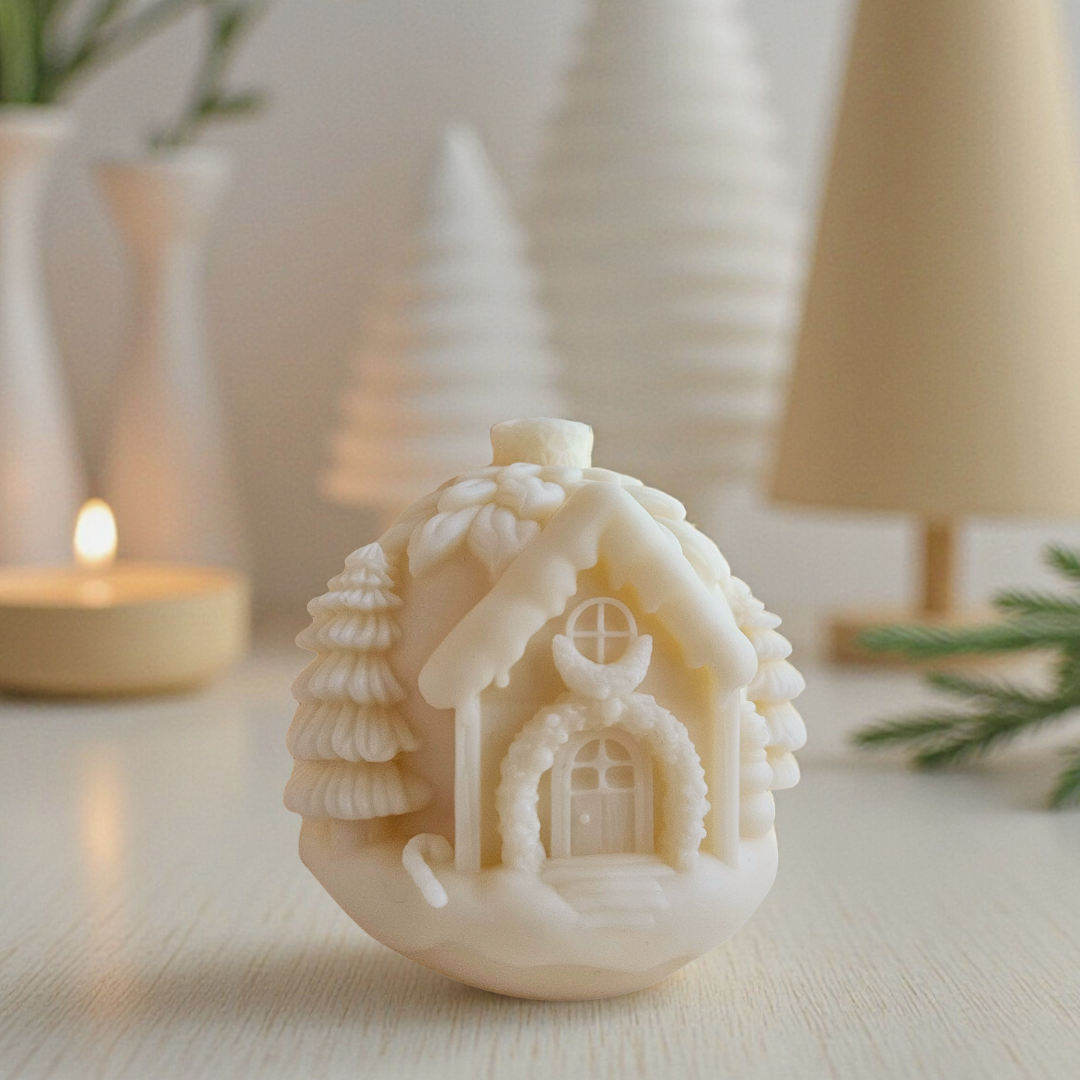 Cette bougie décorative de Noël représente une petite maison enneigée, entourée de sapins sculptés en relief.