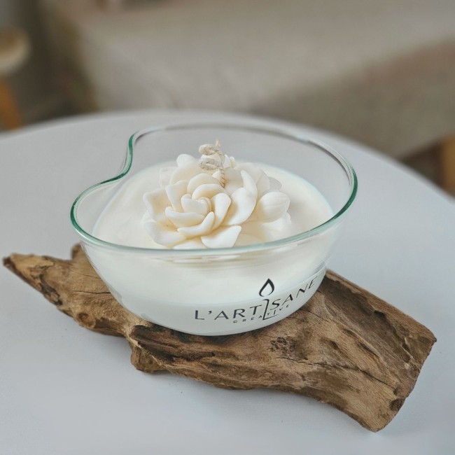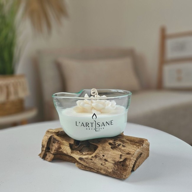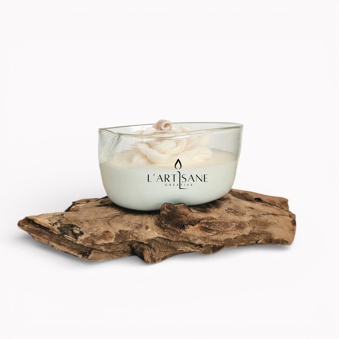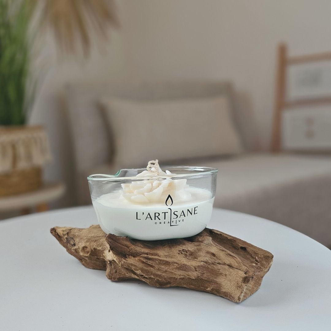 Le verre épouse naturellement la racine et accueille une cire végétale coulée à la main dans l’atelier. La surface de la bougie est décorée d’une fleur en cire réalisée artisanalement, qui apporte une touche délicate à l’ensemble.