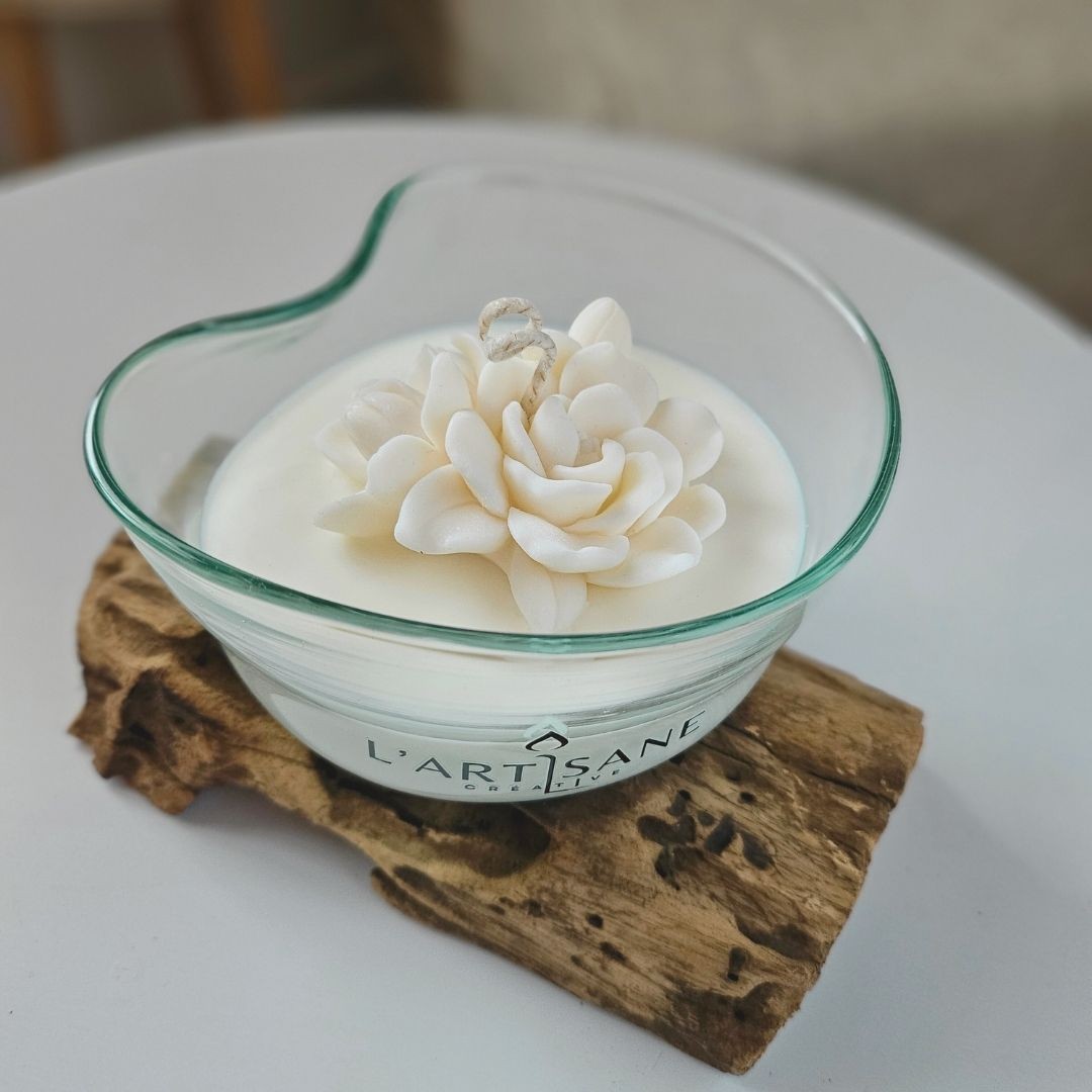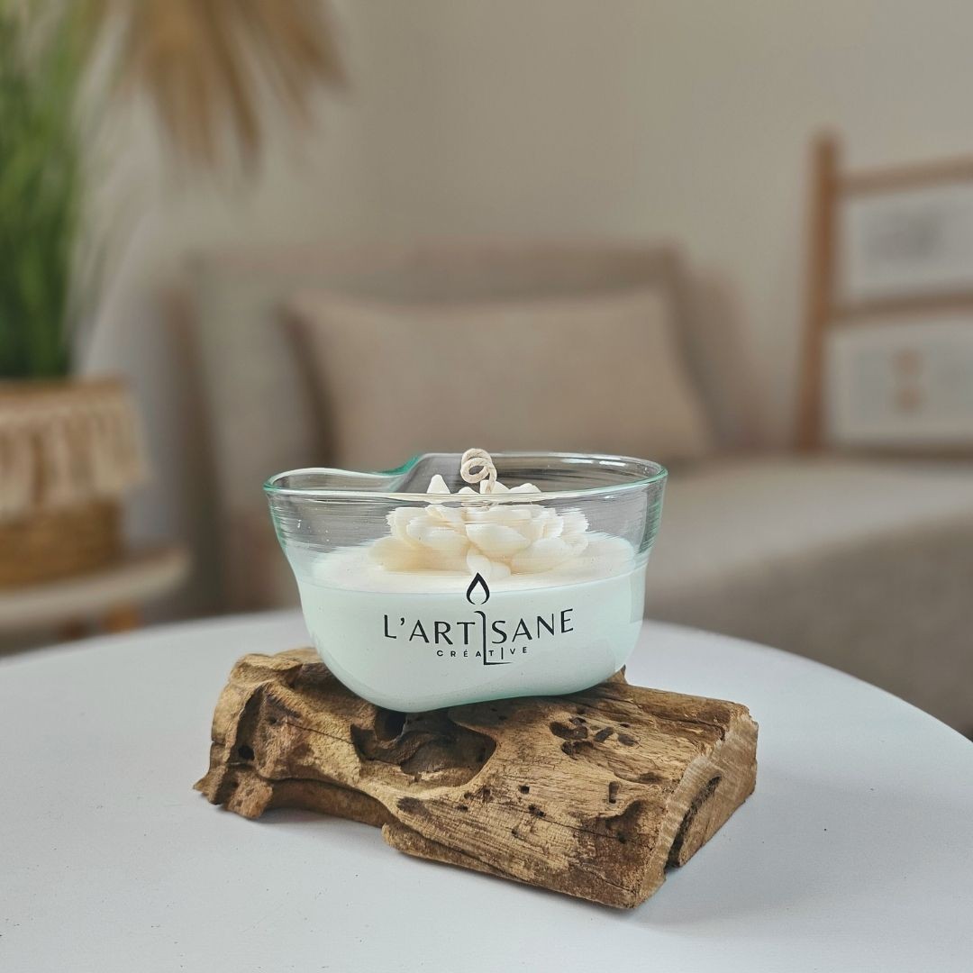 Le verre est directement ajusté à la racine, puis rempli d’une cire végétale coulée à la main dans l’atelier. Sur le dessus, une fleur en cire végétale vient compléter la bougie et apporter une touche décorative douce et naturelle.
