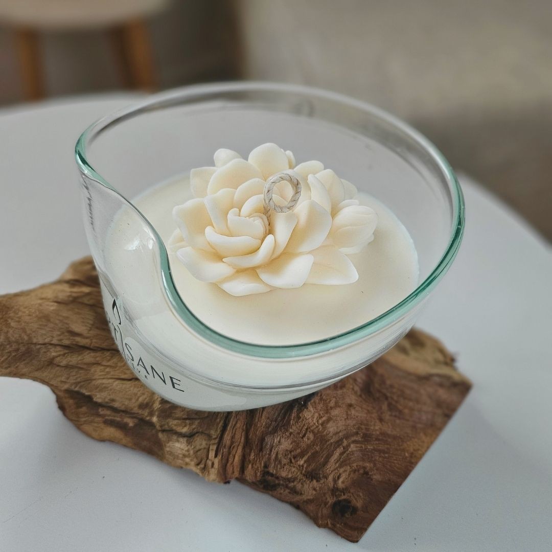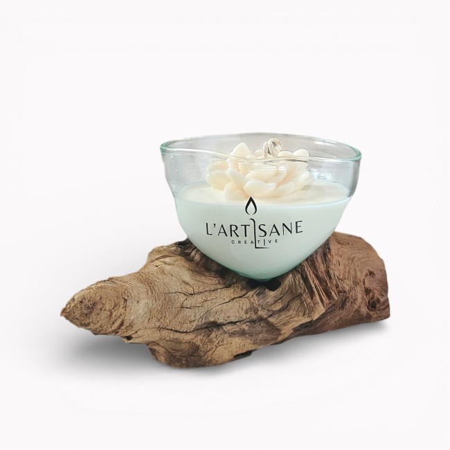 Le verre est ajusté directement à la racine puis rempli d’une cire végétale coulée à la main dans l’atelier. Une fleur décorative en cire végétale vient sublimer l’ensemble et apporte une touche douce et naturelle.