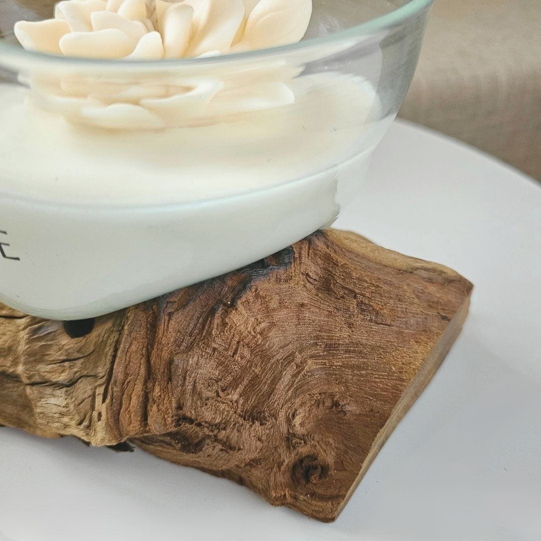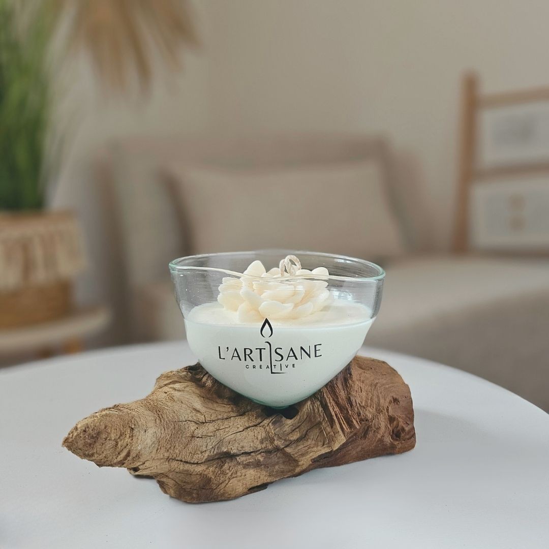 Cette bougie artisanale parfumée Pomme Épicée est présentée dans un verre soufflé délicatement posé sur une véritable racine de bois naturel. Chaque création est unique : la forme de la racine, façonnée par la nature, donne à chaque bougie un caractère authentique et différent.
