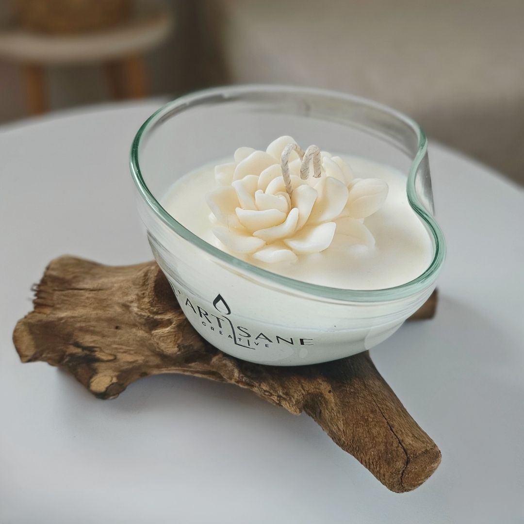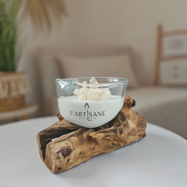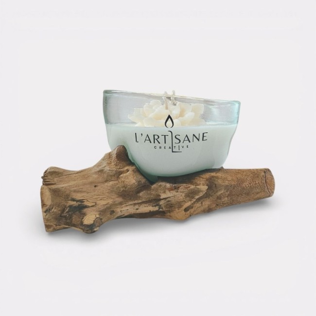Le verre soufflé est directement posé sur la racine, dont les formes naturelles rendent chaque bougie différente. L’ensemble est rempli d’une cire végétale coulée à la main dans l’atelier et décoré d’une fleur en cire végétale.